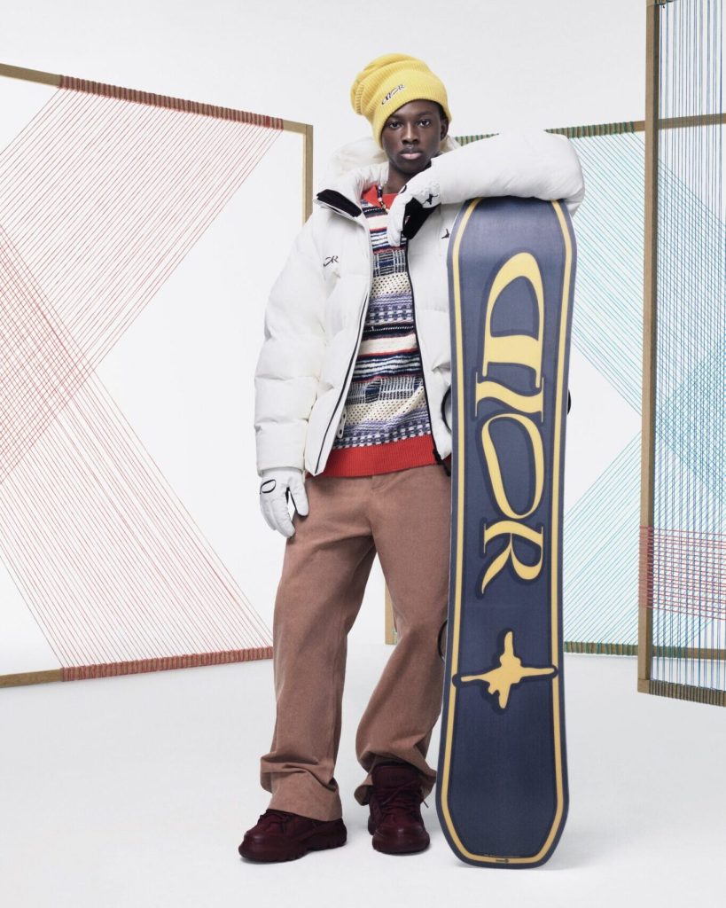 The collection pays homage to what Dior calls a “winter lifestyle,” centering not on Formula One – though racing codes remain a reference – but skiing and snowboarding, “an alternative side to [Hamilton’s] sporting life.” As such, pieces span colorful technical ski jackets and puffers, slouchy salopette-style pants, and an array of knitwear, from cable-knit sweaters to Dior-emblazoned jumpers. There is even the requisite Dior snowboard, helmet, and wraparound sunglasses. Elsewhere, nods to elegance come in collarless tweed blazers and matching trousers. Styled together, the accompanying lookbook captures Hamilton’s eclectic and free-spirited approach to dressing.
